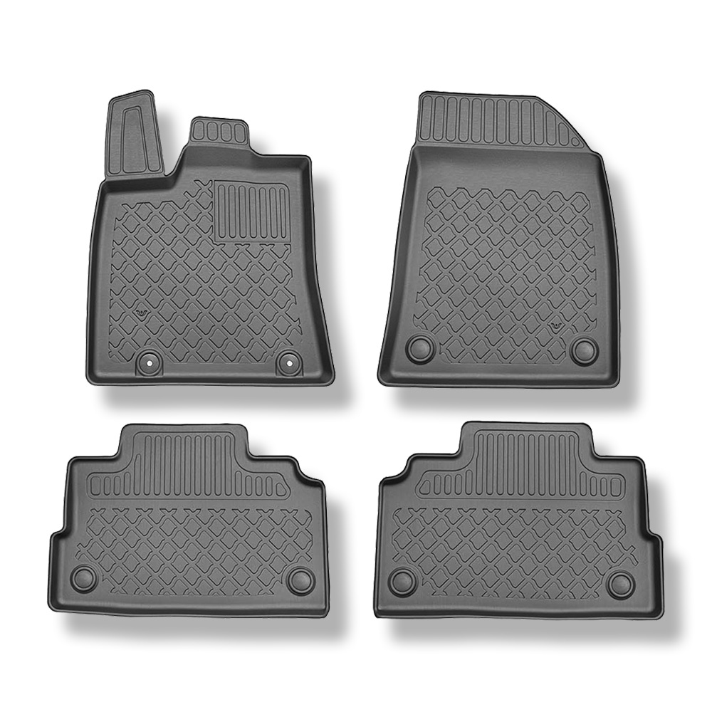 - Den perfekta passformen och golvfästen (om de finns i aktuell bilmodell) förhindrar förflyttning av mattan under färden. Mattorna tillverkas med iakttagande av de högsta kvalitetsstandarderna och material som används i produktionen är säkra för hälsan och återvinningsbara. Mattorna är vattentäta och lättskötta (de kan rengöras under rinnande vatten eller genom högtryckstvätt).
