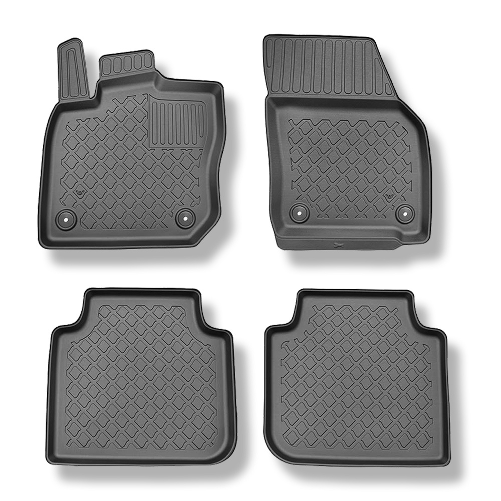 - Den perfekta passformen och golvfästen (om de finns i aktuell bilmodell) förhindrar förflyttning av mattan under färden. Mattorna tillverkas med iakttagande av de högsta kvalitetsstandarderna och material som används i produktionen är säkra för hälsan och återvinningsbara. Mattorna är vattentäta och lättskötta (de kan rengöras under rinnande vatten eller genom högtryckstvätt).