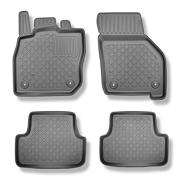 - Den perfekta passformen och golvfästen (om de finns i aktuell bilmodell) förhindrar förflyttning av mattan under färden. Mattorna tillverkas med iakttagande av de högsta kvalitetsstandarderna och material som används i produktionen är säkra för hälsan och återvinningsbara. Mattorna är vattentäta och lättskötta (de kan rengöras under rinnande vatten eller genom högtryckstvätt).