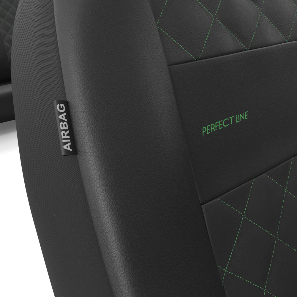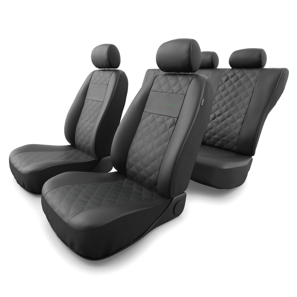 - Överdragen är tillverkade av ett hållbart och fläcktåligt konstläder i svart färg och i mittdelen har en dekorativ kviltning med tråd i grön färg. Överdragen för framsätena är dessutom prydda med broderi.