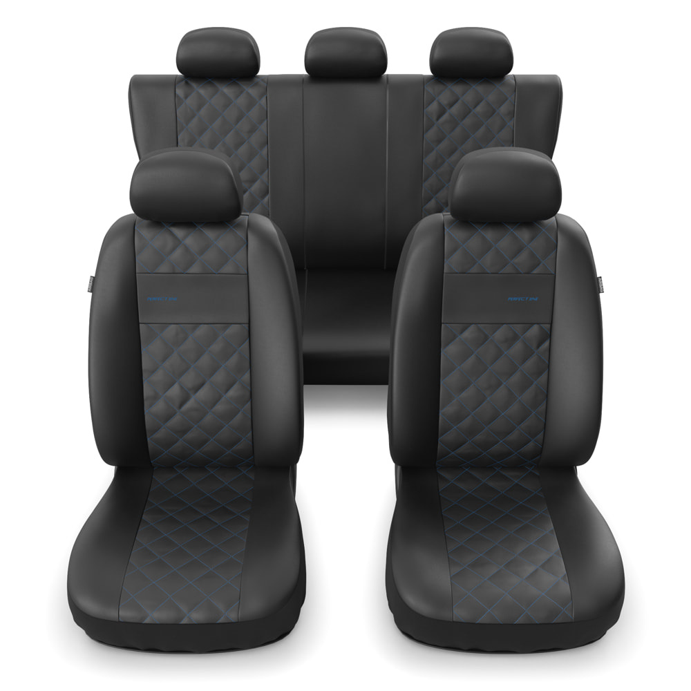 - Överdragen är tillverkade av ett hållbart och fläcktåligt konstläder i svart färg och i mittdelen har en dekorativ kviltning med tråd i blå färg. Överdragen för framsätena är dessutom prydda med broderi.