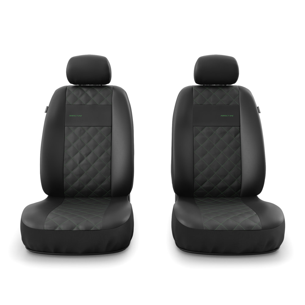 - Överdragen är tillverkade av ett hållbart och fläcktåligt konstläder i svart färg och i mittdelen har en dekorativ kviltning med tråd i grön färg. Överdragen för framsätena är dessutom prydda med broderi.
