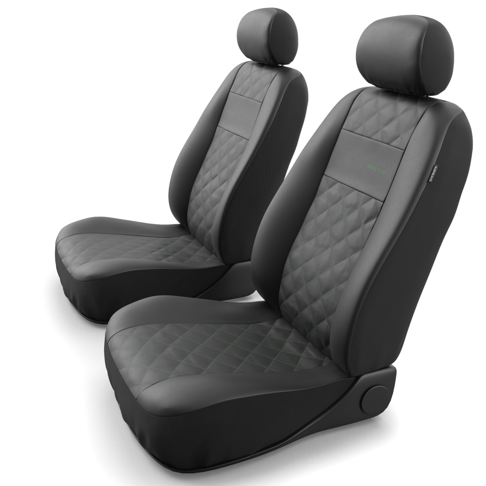 - Överdragen är tillverkade av ett hållbart och fläcktåligt konstläder i svart färg och i mittdelen har en dekorativ kviltning med tråd i grön färg. Överdragen för framsätena är dessutom prydda med broderi.