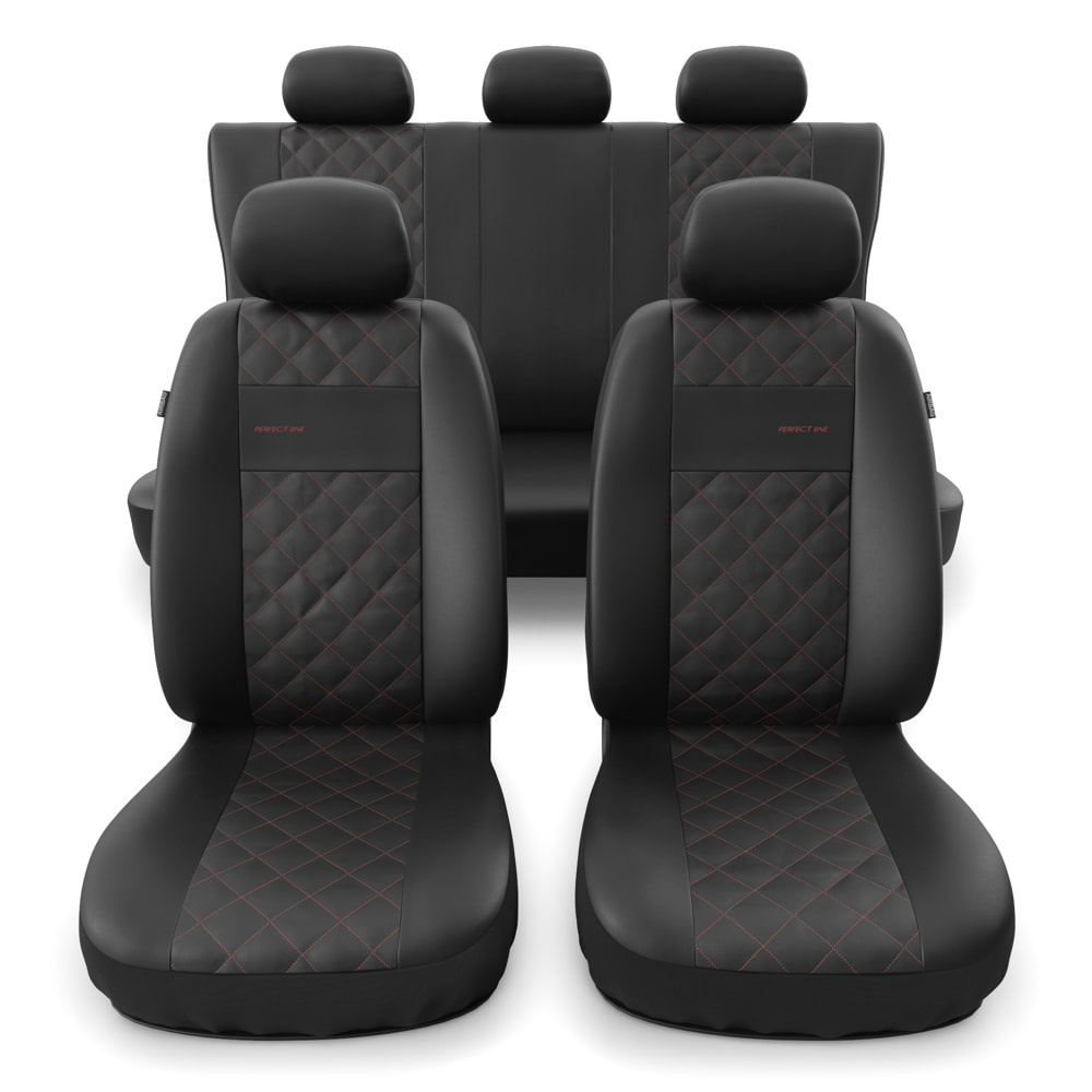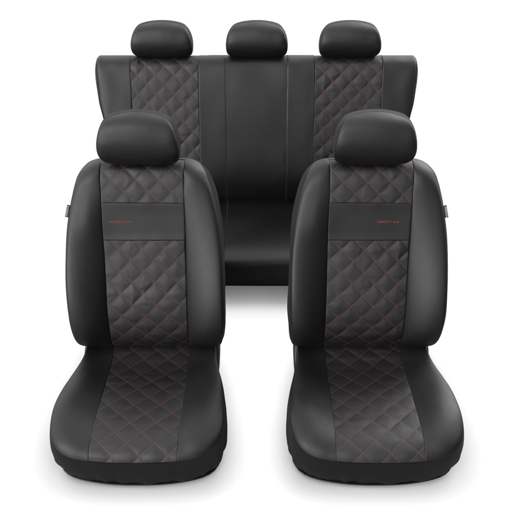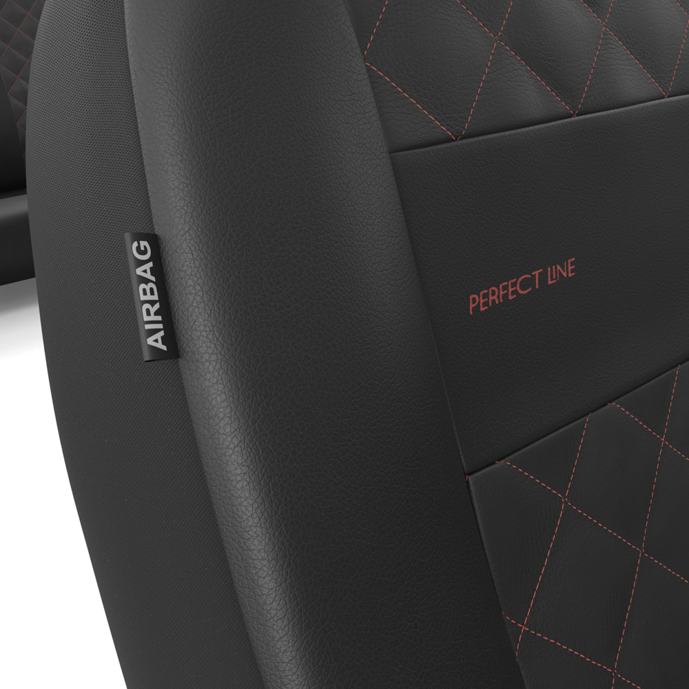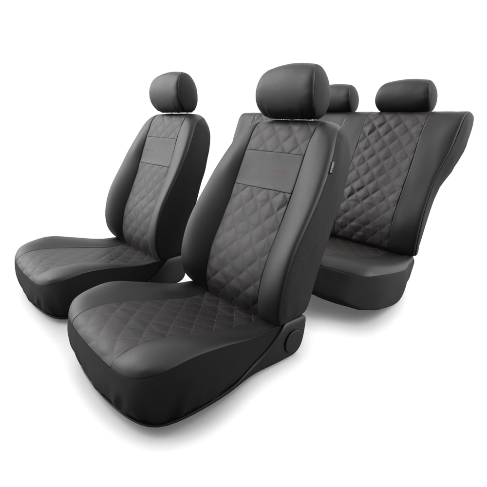 - Överdragen är tillverkade av ett hållbart och fläcktåligt konstläder i svart färg och i mittdelen har en dekorativ kviltning med tråd i röd färg. Överdragen för framsätena är dessutom prydda med broderi.