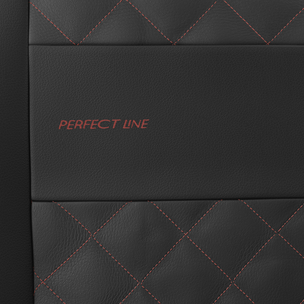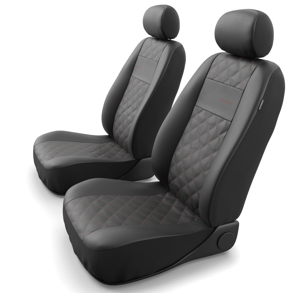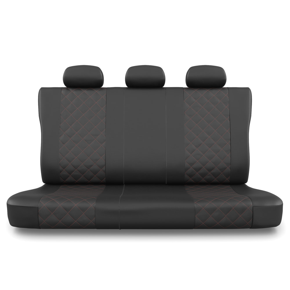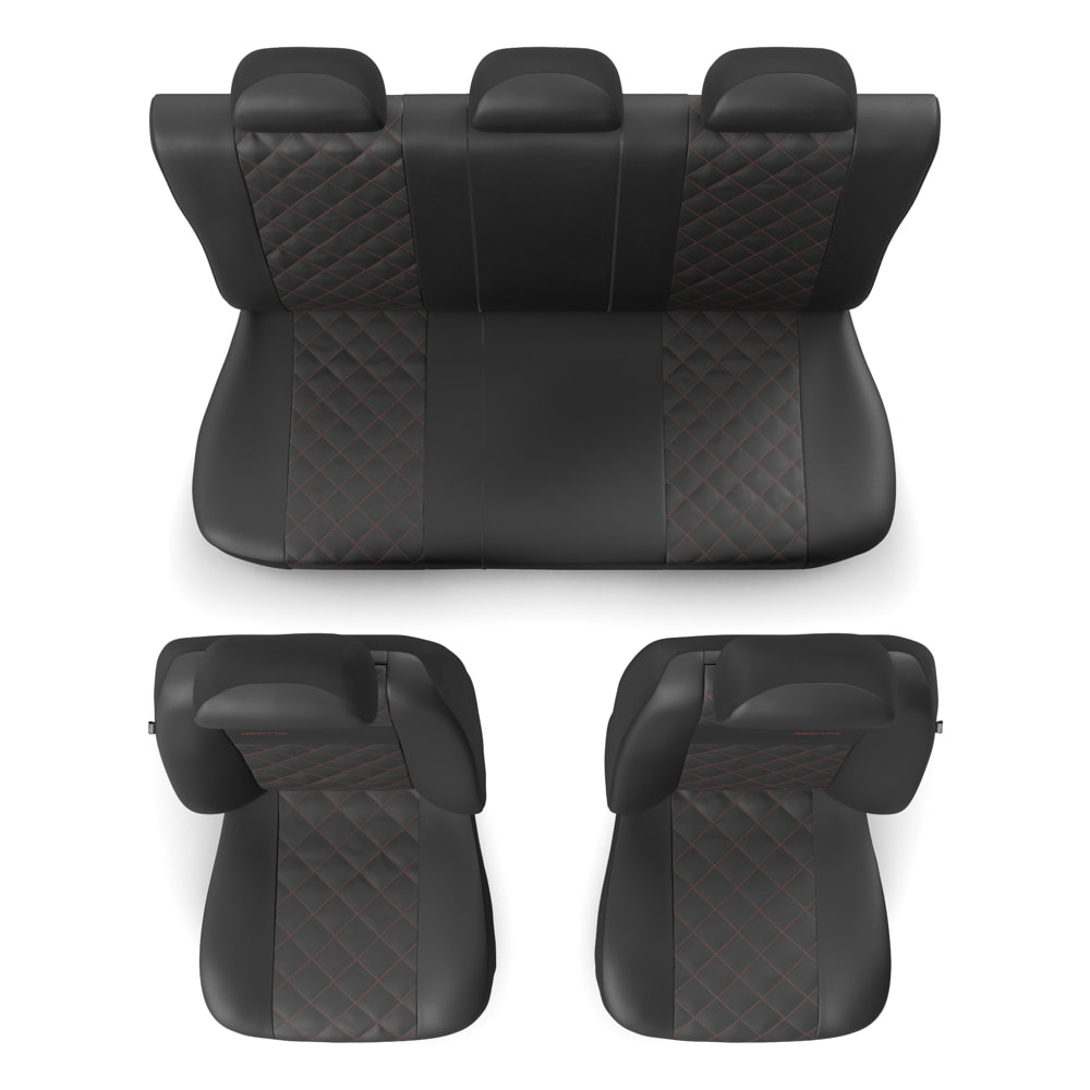 - Överdragen är tillverkade av ett hållbart och fläcktåligt konstläder i svart färg och i mittdelen har en dekorativ kviltning med tråd i röd färg. Överdragen för framsätena är dessutom prydda med broderi.